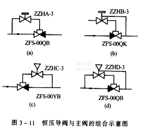 組裝方式見圖3-11 (b)所示。當主閥出口壓力升高, ZZHB-3成比例開大,主閥隨之成比例關小;主閥出口壓力降低,ZZHB-3成比例關小,主閥則成比例開大。所以,這種組合方式可控制主閥的出口壓力恒定在一定范圍內。應用于壓縮機的吸氣管控制時,可防止機器吸氣過載。