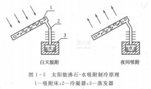 以常見的沸石一水吸附對為例。沸石是一種鋁硅酸鹽礦物,它能夠吸附水蒸氣,且吸附能力的變化對溫度特別敏感,因而它們是較理想的吸附制冷工質對之一。圖1-5示出一個利用太陽能驅動的沸石一水吸附制冷系統原理,它包括吸附床1、冷凝器2和蒸發器3,用管道接成一個封閉的系統。吸附床是充裝了吸附劑(沸石)的金屬盒,制冷劑液體(水)儲集在蒸發器中。白天,吸附床受日照加熱,沸石溫度升高,產生解吸作用,從沸石中脫附出水蒸氣,系統內的水蒸氣壓力上升,達到與環境溫度對應的飽和壓力時,水蒸氣在冷凝器中凝結,同時放出潛熱,冷凝水儲存在蒸發器中。夜間吸附床冷下來,沸石溫度逐漸降低,吸附水蒸氣的能力逐步提高,造成系統內氣體壓力降低,同時,蒸發器中的水不斷蒸發出來,用以補充沸石對水蒸氣的吸附,產生制冷效應。