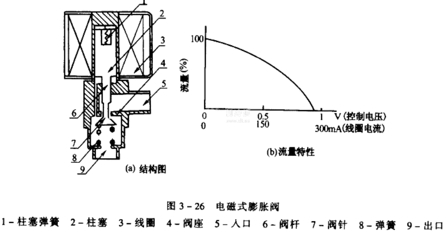 核心提示:電磁式電子膨脹閥結(jié)構(gòu)如圖3-26 ( a)所示,由電磁吸引線圈、柱塞(活動(dòng)鐵芯)、閥針、閥座及反力彈簧等組成。