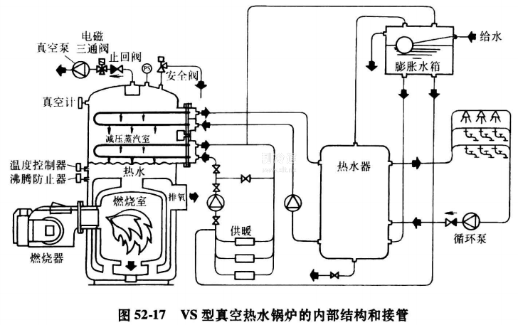核心提示:vs型真空熱水鍋爐是一種結構新穎、高效節能的億式多用途熱水鍋爐。其內部結構和外部系統的接管、流程大致如圖52-17所示。