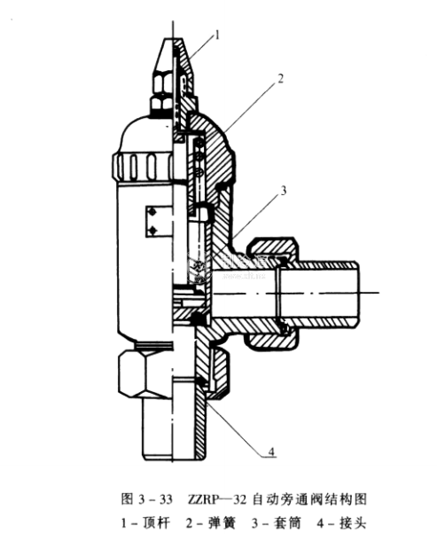 ZZRP-32型自動旁通閥,適用于以氨R12, R22為工質(zhì)的制冷系統(tǒng)中。它是安全閥的一種形式,起定壓旁通作用。圖3-33是ZZRP-32型自動旁通閥結(jié)構(gòu)圖。