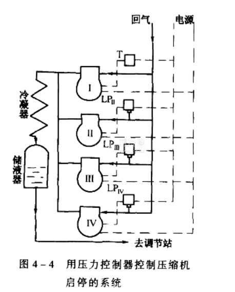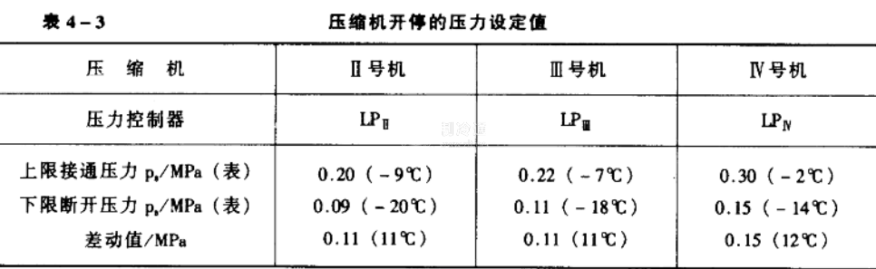 某冷庫制冷系統(tǒng)的配置為四臺(tái)氨壓縮機(jī):4AS12.5(I號(hào)機(jī))、8AS12.5(II號(hào)機(jī))、8AS12.5(Ш號(hào)機(jī))、4AS12.5 (IV號(hào)機(jī))。I號(hào)機(jī)為基本能級(jí),它的啟停受庫房溫度的控制:只要有一個(gè)庫房升到溫度上限時(shí),I號(hào)機(jī)便投入運(yùn)行,只有當(dāng)全部庫房都降到溫度下限時(shí),I號(hào)機(jī)才停機(jī)。I號(hào)機(jī)運(yùn)行后,根據(jù)吸氣壓力的變化來決定II、Ш、IV號(hào)機(jī)是否投入運(yùn)行。在此用三只壓力控制器分別控制II、Ш、IV號(hào)壓縮機(jī)的啟停,如圖4-4所示。每臺(tái)壓縮機(jī)的啟停壓力設(shè)定值見表4-3。