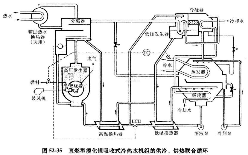 圖52-34所示的供熱循環代表第二種模式。此時機組增加一只輔助熱水換熱器。機組運行時,只需高溫發生器部分投入運行,其余部分均可靠閥門關斷隔開。這時,高溫發生器內產生的冷劑蒸汽,改接用于加熱熱水,釋放出熱量后生成的凝水,直接返回高溫發生器。由此可見,在此模式下作為吸收劑的溶液可不參加循環。