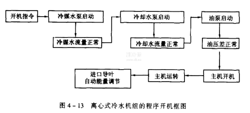 離心式冷水機(jī)組的程序開機(jī)如圖4-13所示。