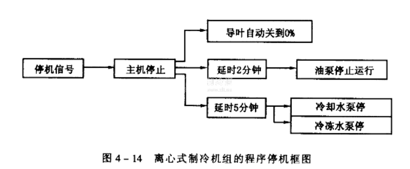 空調(diào)用離心式制冷機(jī)組的停機(jī)程序如圖4-14所示。