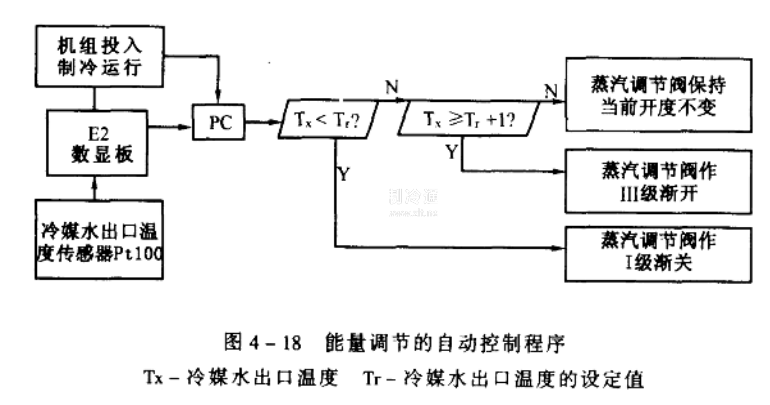 加熱蒸汽量的調節就是根據冷媒水出口溫度的變化,控制加熱蒸汽調節閥的動作,改變加熱蒸汽的流量。能量調節原理示意圖如圖4-17所示。