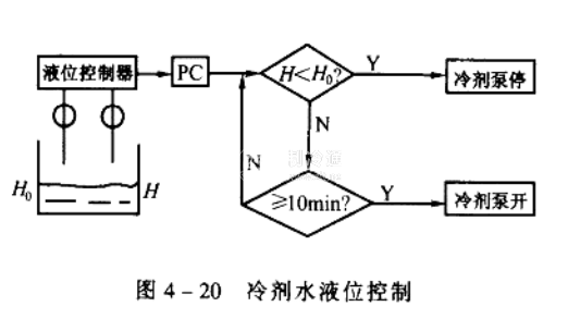 在機組運行工況和負荷發生變化時,蒸發器液囊中的冷劑水位波動較大。液位過高時可以通過溢流解決。液位過低時,會引起冷劑水泵受氣蝕損壞。控制措施為:在蒸發器液囊中安裝兩支液位檢測電極。液位降到最低控制值下限時,冷劑水泵停機;液位回升到控制值上限時,重新開泵運轉。PC控制過程如圖4-20所示。