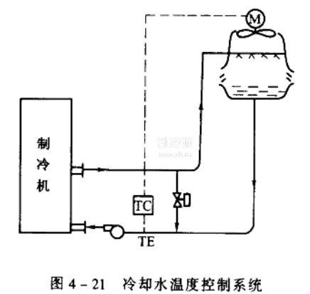 冷卻水溫度控制系統如圖4-21所示,用溫度傳感器檢測冷卻水入口溫度,當水溫低于設定值下限時,打開循環水系統的旁通調節閥,同時關閉冷卻塔風機。當水溫回升時,首先啟動冷卻塔風機,調節器根據冷卻水檢測溫度與設定值的偏差調節旁通閥的開度。如果冷卻水溫度高于設定的上限,發出聲光報普,并使機組轉入稀釋運行。