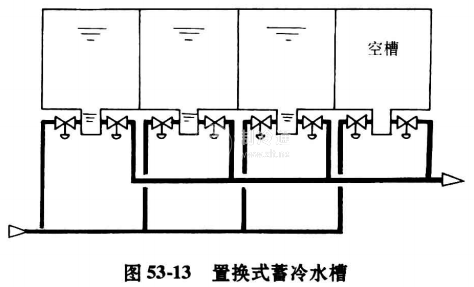 置換式蓄冷水槽 典型的置換式蓄冷水槽示于圖53-13。這是由一系列結(jié)構(gòu)、外形尺寸相同的多個單體小水槽,通過水管連接組合而成。在這若干小水槽中,輪流讓一只水槽保持空置狀態(tài),當(dāng)前一水槽相應(yīng)的閥門打開,接通冷水分布系統(tǒng)并泵送冷水進(jìn)行供冷時,其熱回水則進(jìn)入空槽。一旦當(dāng)該槽中的冷水被用盡,成為空槽后,便立即被置換成供容納系統(tǒng)回水之用。如此依次操作相應(yīng)的閥門,即可對各小水槽進(jìn)行依次的蓄冷和釋冷。