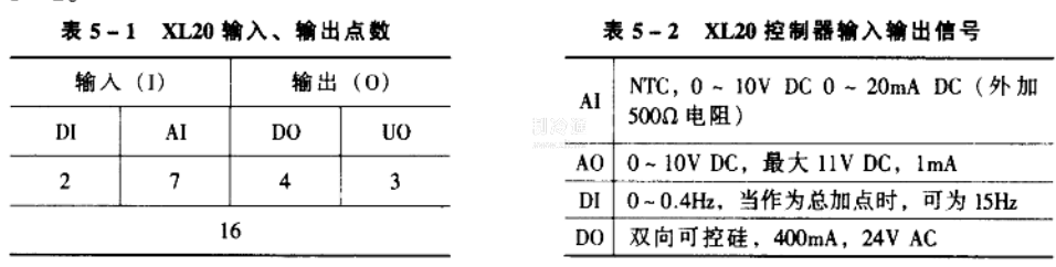 XL20有固定的輸入、輸出配置。其輸入、輸出點數及信號種類分別見表5-1,表5-2。