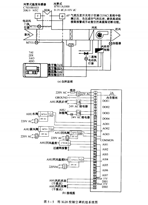 圖5-5 (a)用X L20控制空調機組的原理圖,(b)為其接線圖。一般來說,每臺控制器與執行器的供電均采用CRT2型變壓器(220V/24V, 40VA)單獨供電。