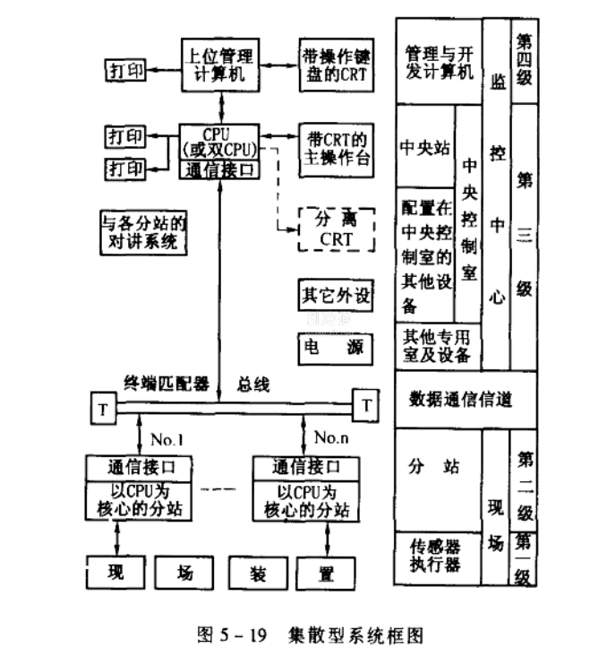 集散型控制系統由一個(或多個)中央站實現監控管理功能,用數據通信通道——總線,把完成分散控制功能的多個分站,連成一個整體系統。集散型控制系統的結構如圖5-19所示。最多可由四級組成。
