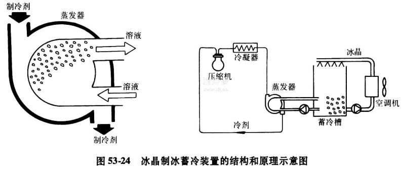 由于形成的冰晶顆拉密度較小,在進蓄冷槽后即趨向上浮。這種自然的層化現象,十分有利于制冰循環和釋冷循環。另外,由于冰晶顆粒十分微細,所以可用水泵直接輸送,而無障礙。冰晶式蓄冷裝置的另一優點是蓄冰率比較大,約為60%。