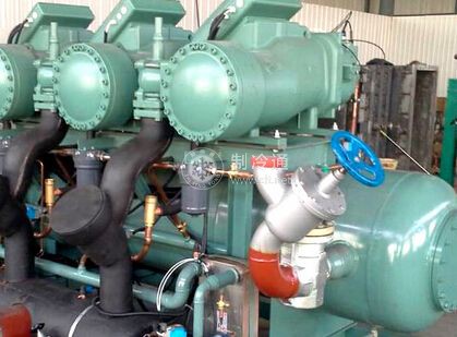 為防止氨液進入壓縮機,當低壓循環貯液桶的液位達到超高液位時,應停機、報警。防止液體吸人壓縮機的危險液位,對于立式桶應控制在70%左右,對臥式桶應控制在50%左右。低壓循環貯液捅的液位超高報警.采用一套UQK-40型電感浮球液位控制器,裝于桶高的70%處。當捅內液位超高時,控制器的輸出繼電器動作,發報警信號,并通過延時繼電器延時,在規定時間內若液位仍不下降,壓縮機便自動停機。