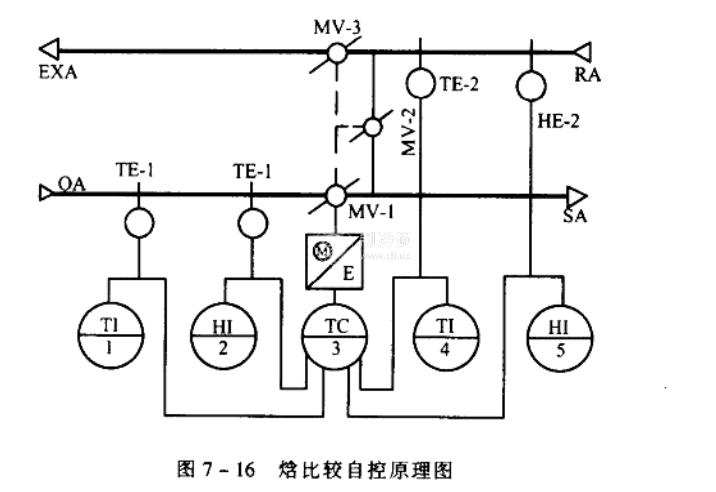 7-16是焓比較自動控制系統原理圖。因為空氣焓值是空氣干球濕度和相對溫度的函數,所以,焓比較器TC-3的輸入信號有新、回風的干球溫度和相對濕度信號。即回風溫度傳感器TE-2與溫度變送器HE-2新風溫度傳感器TE-1與濕度變送器HE-1,均接在TC-3輸入端。TC-3輸出0~10 V· DC (PI)信號,控制執行機構,再通過機械聯動裝置使新、回、排風門按比例開啟。