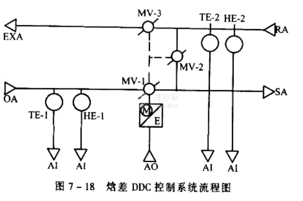 焓控制器輸出與新風閥位的關系見圖7-17,焓比較自動控制系統的DDC控制見圖7-18