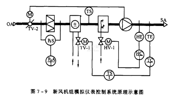 圖7-9是帶有加濕裝里的新風機組模擬儀表控制系統原理示意圖。濕度傳感器TE將送風濕度信號送入溫度控制器TC-1, TC一1通過轉換開關TS-1按冬、夏工況控制電動雙通調節閥TV-1,改變進RU 換熱器內的冷、熱水量,以維持送風濕度的相對恒定。溫度傳感器HE通過溫度調節器HC-1控制加濕調節閥HV-1,改變蒸汽量來維持送風溫度的相對恒定。