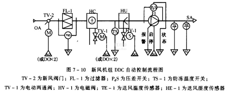 圖7-10是新風機組的直接數字控制(UDC)系統流程圖。其溫度控制系統由溫度傳感器TE、執行器TV-1及換熱器和新風閥TV -2組成;濕度控制系統由濕度傳感器HE-1、加濕器電動雙通調節閥HV-1、加濕器等組成。報警與風機的運行狀態和故障狀態監視系統,由過濾器壓差開關PdS、防凍開關TS、風機過流繼電器常開觸點(事故報警)、風機前后的壓差開關常開觸點(狀態監視)及DDC輸出繼電器模塊組成。