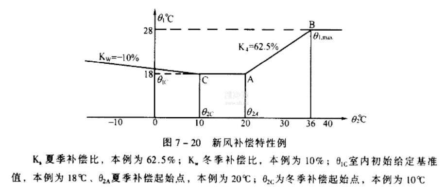 冬季,隨著室外新風(fēng)溫度的降低,適當(dāng)提高系統(tǒng)的送風(fēng)溫度,用以補償由于冷幅射而增大的熱量損失;夏季,隨著室外氣溫的升高,適當(dāng)提高空調(diào)房間內(nèi)的溫度標(biāo)準(zhǔn),以消除由于室內(nèi)外溫差較大而造成的不舒服感覺。新風(fēng)補償?shù)奶匦匀鐖D7-20所示。