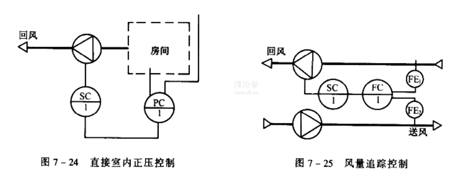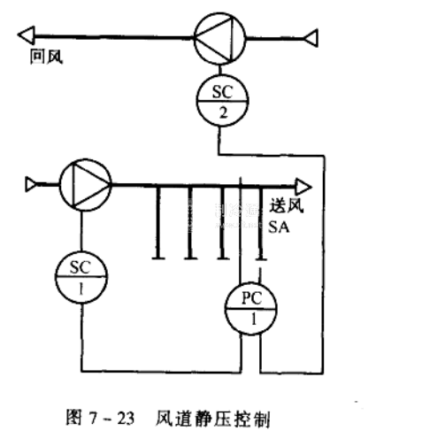 7-22所示的變風量自動控制系統,采用風道靜壓控制,由風壓變送器PE測出風道靜壓,控制器PC-1通過變速裝置SC-1SC-2分別控制送風機和回風機的轉速,以獲得送、回風機的平衡。