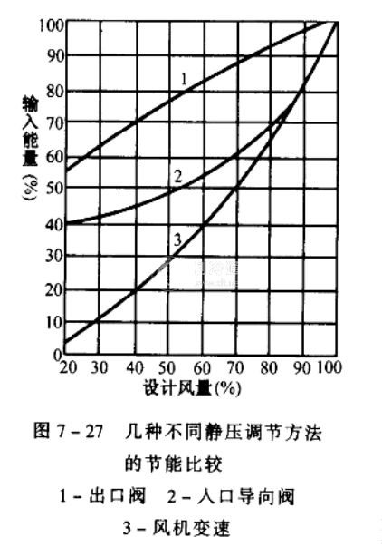 風量的幾種調節方法節能比較見圖7-27由圖可見,變轉速調節風量的節能效果最好,口導向閥調節風的節能效果次之,出口閥調節風量的節能最少。從圖中還可以看出,風機越接近于滿負荷,變風機轉速和人口閥調節風量兩種調節方法的節能效果越接近。實際運行中的風機,風量多在50%~100%之間變化,在這段變化范圍內,兩種控制方法的節能效果相差不大。