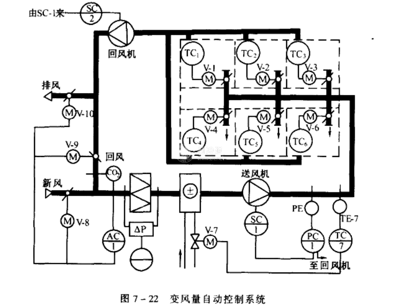 在圖7-22所示的空調系統中,設置了空氣品質控制。利用CO?變送器測量回風中CO?含量,當其含量超過標準時,通過控制器AC-1調節新風閥門V-8的開度,同時控制回風閥門V-9及