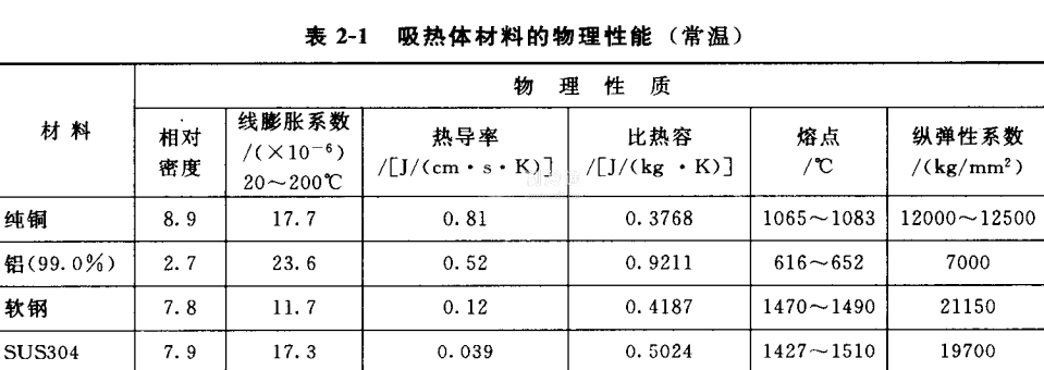 吸熱部件一般采用銅、鋁合金、銅鋁復合材料、不銹鋼以及鍍鋅鋼等,同時考慮載熱介質流道與流體工質的相容性,吸熱體多采用金屬材料,幾種主要吸熱體材料的物理性能見表2-1。吸熱部件的背面和側面材料一般采用發泡塑料、橡膠等保溫材料。