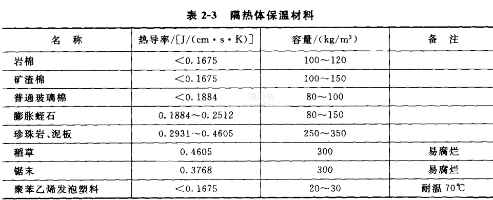 隔熱體又稱保溫層,它的作用是抑制吸熱板通過熱傳導(dǎo)向周圍環(huán)境散熱,減少熱水器吸熱體底部和四周邊的熱損失。作為隔熱體的材料應(yīng)具有熱導(dǎo)率小、吸水性小、耐高溫、不分解、便于安裝、價格低廉等特點,常用隔熱體的保溫材料如表2-3所示。