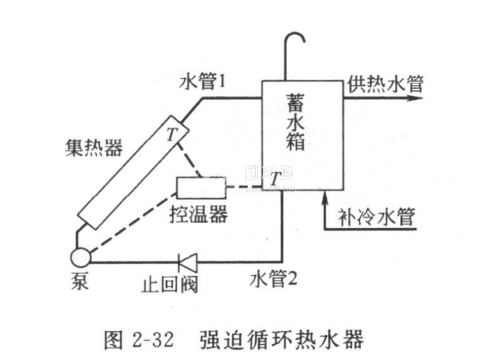強(qiáng)迫循環(huán)式太陽能熱水裝置主要由集熱器、蓄水箱、水泵、控溫器與管道組成(圖2-32)。水泵將水箱中的水通過循環(huán)水管1打入集熱器的下集管。水經(jīng)過排管到上集管,然后通過循環(huán)水管2回到水箱。水泵使水不斷循環(huán)。這種以外力作為循環(huán)動力的熱水器叫做強(qiáng)迫循環(huán)熱水器。