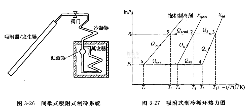 最簡單的基本型吸附式制冷系統(tǒng)及相應的熱力循環(huán)圖分別如圖3-26和圖3-27所示。