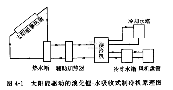 太陽能吸收式制冷,如圖4-1所示主要包括兩大部分:太陽能熱利用系統以及吸收式制冷機。太陽能熱利用系統包括太陽能收集、轉化以及貯存等構件,其中最核心的部件是太陽能集熱器。適用于太陽能吸收式制冷領域的太陽能集熱器有平板集熱器、真空管集熱器、復合拋物面聚光集熱器、以及拋物面槽式等線聚焦集熱器。