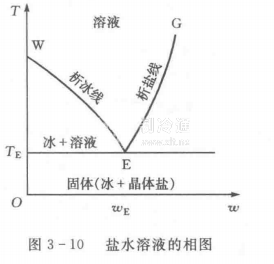 310是鹽水溶液的相圖(T-w圖)。圖中給出鹽水溶液的相圖水溶液狀態(tài)與溫度T和鹽的質(zhì)量分數(shù)w的關系。曲線WE為析冰線,EG為析鹽線,E點為共晶點。共品點所對應的溫度TE和鹽的質(zhì)量分數(shù)WE分別叫做共品溫度和共品質(zhì)量分數(shù)。溶液溫度降低發(fā)生相變時的情況與鹽的質(zhì)量分數(shù)有關。當w<wE,溶液降溫凝固時首先析出水冰,隨著w增大析冰溫度降低,直到w=wE生時,達到最低結(jié)冰溫度TE。當鹽的質(zhì)量分數(shù)繼續(xù)增大,w>wE時,溶液降溫凝固時先析出鹽,析鹽溫度隨鹽的質(zhì)量分數(shù)的增大而升高。共晶溫度是溶液不出現(xiàn)析冰或析鹽的最低溫度。