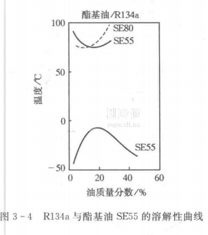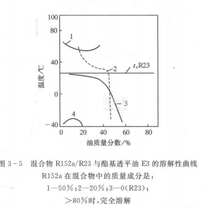 圖3-4是制冷劑R134a與酯基油SE55的溶解性曲線。可以看出,在高溫區和低溫區各有一個有限溶油區。圖3-5給出二元混合物R152a/R23與酯基透平油E3的溶解性。當混合物中R152a的含量超過80%時,能夠與油完全溶解;隨著R152a含量的減少,混合物與油的互溶性變差。圖3-6示出R134a與酯基透平油E3的溶解性以及在R134a中添入R152a對溶油性的改善。