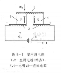 由于電子和空穴的移動均使金屬片2升溫,形成熱端:使金屬片1降溫,形成冷端,所以熱電對在冷端吸收周圍介質的熱量,達到制冷的目的。圖8-1中示出給定電流方向時結點的熱流方向,若電流反向,則結點1和2的熱流方向與圖示相反,可見,熱電偶既可制冷,又可加熱,只需改變電流方向就能切換。