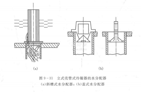 圖9一31(a)所示的斜槽式水分配器,水經過斜槽流人管內,在管子內壁上呈膜狀流動,同時空氣在管子中心部分向上流動,這不但可節省冷卻水量,也可增強對流換熱作用,水分配器一般為鑄鐵或陶瓷制造。圖9-31(b)所示的蓋式水分配器的應用越來越廣。