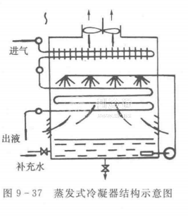 蒸發(fā)式冷凝器利用水蒸發(fā)時吸收熱量,使管內(nèi)的制冷劑蒸氣凝結(jié)。它的結(jié)構(gòu)示意圖見圖9-37,在薄鋼板制成的箱體內(nèi)裝有蛇形管組。管組上面為噴水裝置。制冷劑蒸氣從蛇形管上面進(jìn)入管內(nèi),冷凝液由下部流出。制冷劑放出的熱量使噴淋在管表面的液膜蒸發(fā)。箱體上方裝有擋水板,阻擋被空氣帶出的水滴,減少水的飛散損失。未蒸發(fā)的噴淋水落入下面的水池,并有部分水排出水池。水池中有浮球閥調(diào)節(jié)補(bǔ)充水量,使之保持一定水位和含鹽量,在擋水板上面設(shè)有預(yù)冷管組,降低進(jìn)入淋水管的制冷劑蒸氣溫度,減少管外表層的結(jié)垢。