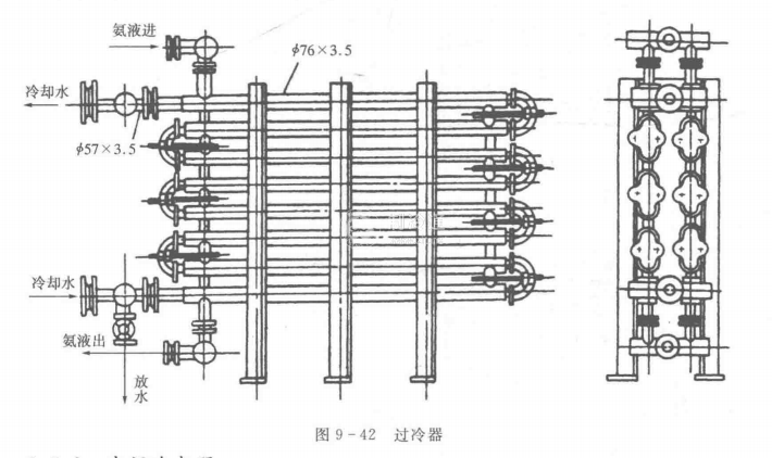 過冷器結構簡單,有套管式和殼管式。圖9-42所示為氨用套管式過冷器結構。它是由兩根直徑分別為57mm76mm的無縫鋼管組成。液氨自上而下在管間流動,冷卻水則以逆流方式由下而上在管內流動。管子兩端由U型鑄鐵蓋相連,以便于拆卸后清除水垢。