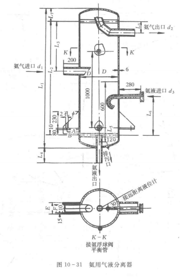 一般用于大中型氨制冷裝置。這種氣液分離器有立式和臥式兩種。圖10-31示出了氨制冷裝置用立式氣液分離器的結構。這種氣液分離器中的液滴是依靠氣流速度的減慢和流動方向的改變而分離的。設計和使用時,蒸氣在筒體內的流速不應大于0,5/s。
