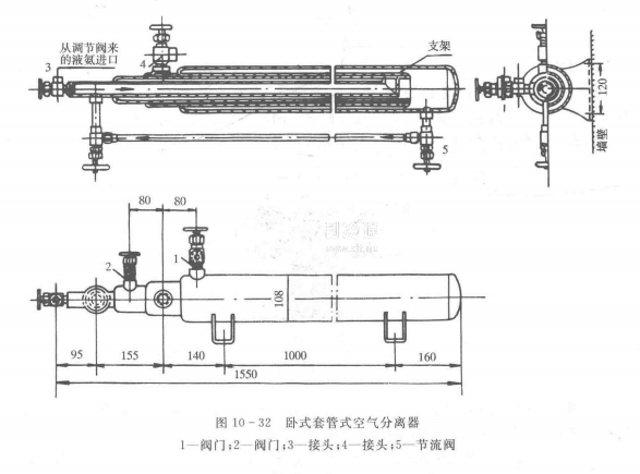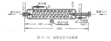 圖10一33表示一種盤管式(立式)空氣分離器。制冷劑液體經節流后從氨液人口處進入,蒸發的蒸氣從氨液出口處引入壓縮機吸氣管中。混合氣體從混合氣進口處進入,在殼體內冷卻,使其中的制冷劑蒸氣凝結成液體,液體經節流閥后進人盤管。使用節流閥前,應關閉氨液人口前的節流閥,分離的空氣由閥門放空。