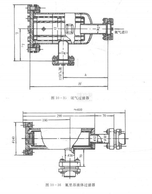 3.過濾器過濾器用于清除制冷劑中的機械雜質,如金屬屑及氧化皮等。氨用過濾器一般由2~3層網孔為0,4mm的鋼絲網制成,氟里昂過濾器則由網孔為0.1~0.2mm的銅絲網制成。圖10-34表示氨液過濾器的結構,圖10-35表示氨氣過濾器的結構。