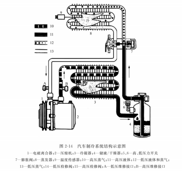 (1)制冷系統。制冷系統(圖2-14)對車室內空氣或由外部進入車室內的新鮮空氣進行冷卻或除濕,使車室內空氣變得涼爽舒適。