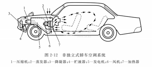 非獨立式汽車空調(diào)系統(tǒng)的制冷壓縮機由汽車本身的發(fā)動機驅(qū)動,汽車空調(diào)系統(tǒng)的制冷性能受汽車發(fā)動機工況的影響較大,工作穩(wěn)定性較差。尤其是在低速時制冷量不足,而在高速時制冷量過剩,并且消耗功率較大,影響發(fā)動機動力性能。這種類型的汽車空調(diào)系統(tǒng)一般用于制冷量相對較小的中小型汽車上,如圖2-12所示。