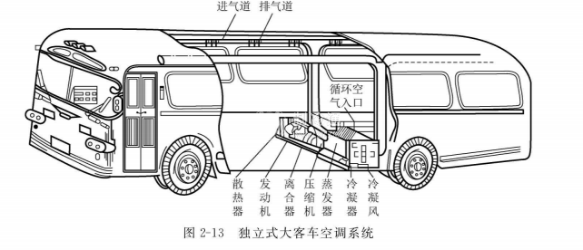 獨立式汽車空調(diào)系統(tǒng)的制冷壓縮機由專用的空調(diào)發(fā)動機(也稱副發(fā)動機)驅(qū)動,汽車空調(diào)系統(tǒng)的制冷性能不受汽車主發(fā)動機工況的影響,工作穩(wěn)定,制冷量大。但由于加裝了一臺發(fā)動機,不僅成本增加,而且體積和質(zhì)量也增加了。這種類型的汽車空調(diào)系統(tǒng)多用于大、中型客車上,如圖2-13所示。