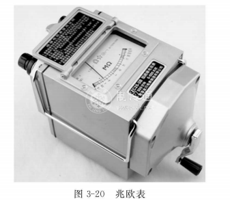 兆歐表(圖3-20)又稱搖表,其種類有很多,但其作用大致相同。兆歐表是專供用來檢測電氣設備、供電線路的絕緣電阻的一種便攜式儀表。一般用來測量兆歐(MΩ)數量級的電阻值,它的刻度是以兆歐(MΩ)為單位的。