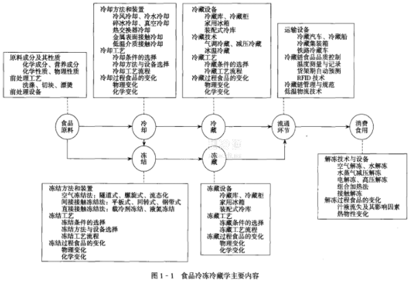 食品冷凍冷藏涉及多學(xué)科、多專業(yè)的知識,且包括原料處理、冷卻、冷藏、冷凍、凍藏、運輸、銷售等多個環(huán)節(jié),研究內(nèi)容涉及原理、方法、設(shè)備、工藝、安全、管理等。如圖―1所示,食品冷凍冷藏學(xué)的主要研究內(nèi)容如下。