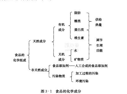 食品成分可分為天然成分和非天然成分,如圖3-1所示。天然成分又可分為無機成分和有機成分;非天然成分是指由人工合成的各種食品添加劑,也包括加工過程中的污染物質。無機成分如水和礦物質;有機成分最主要的有蛋白質、糖類、脂類、維生素類等。其中,蛋白質、糖類、脂類和維生素為四大基本營養素。