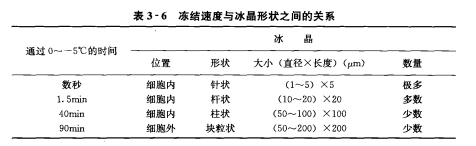 在凍結過程中,食品組織內冰結晶的大小與分布情況對食品的質量有很大影響。冰晶的大小與凍結速度有關,表3·6列出了凍結速度和冰晶形狀之間的關系。