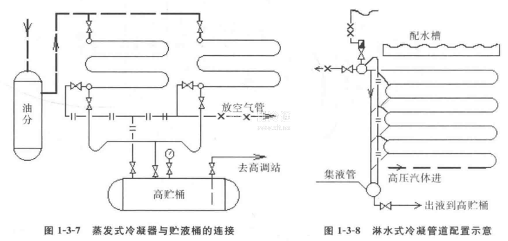 立式冷凝器和臥式冷凝器的管道配置可參見圖1-3-5和圖1-3-6。立式冷凝器可以不設置放油管。