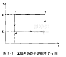 逆卡諾循環(huán)工作在一個(gè)恒溫?zé)嵩春鸵粋€(gè)恒溫冷源之間,由兩個(gè)可逆等溫過(guò)程和兩個(gè)可逆絕熱過(guò)程組成,循環(huán)沿逆時(shí)針?lè)较蜻M(jìn)行。設(shè)恒溫冷源的溫度為T,恒溫?zé)嵩吹臏囟葹門1,并假定制冷劑在循環(huán)中,向恒溫冷源吸熱時(shí)的溫度及向恒溫?zé)嵩磁艧釙r(shí)的溫度也分別為T。與T1,即無(wú)溫差傳熱。該循環(huán)過(guò)程的T-s(溫嫡?qǐng)D)如圖5-1所示。