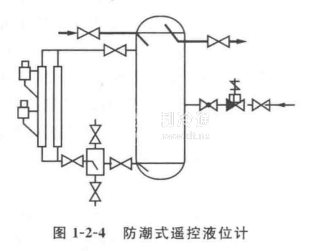 由于低溫制冷劑液體直接和遙控液位計接觸,容易使線圈受潮短路而燒毀,可在液位計的均液管上增設貯油器(即油包),使液位計與油接觸,間接反映設備內的液位變化,如圖1-2-4所示。
